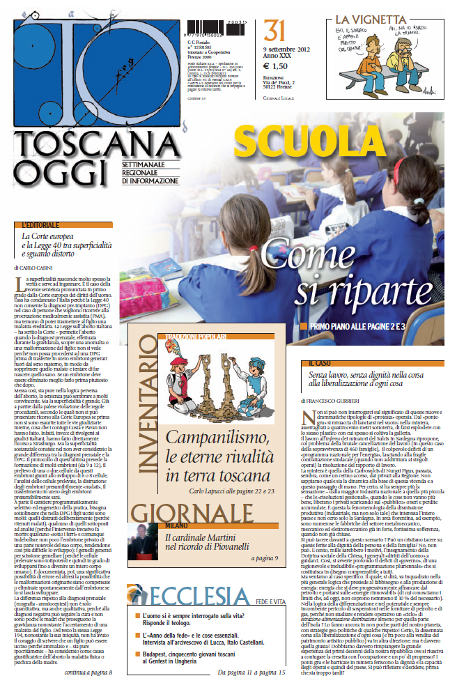 to“Scuola. Come si riparte”. Questo il titolo di apertura di Toscana Oggi. In prima pagina anche l’editoriale di Carlo Casini dal titolo: “La Corte europea e la Legge 40 tra superficialità e sguardo distorto”.