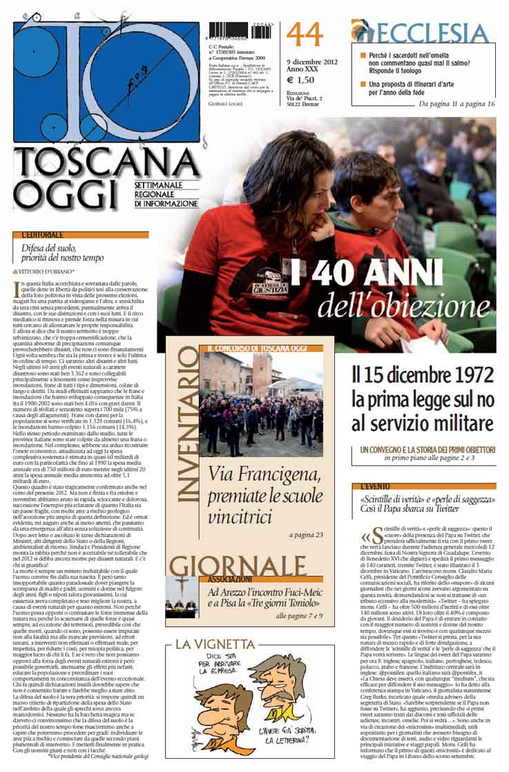 “I 40 anni dell’obiezione“. È questo il titolo di apertura del numero 44 di Toscana Oggi. All’interno la storia di Fabrizio Fabbrini, fondatore del Movimento internazionale di riconciliazione, che a “10 giorni dal congedo rifiutò di rivestire la divisa”. In prima pagina anche l’editoriale di Vittorio D’oriano, Vice presidente del Consiglio nazionale geologi dal titolo “Difesa del suolo, priorità del nostro tempo”.