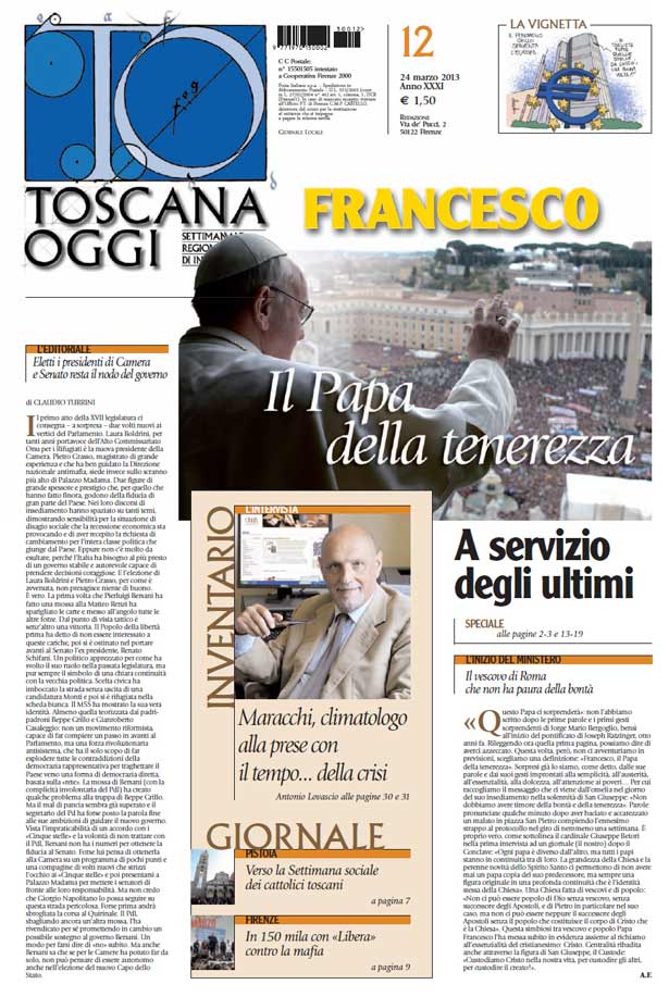 Sono dedicate a Papa Francesco entrambe le aperture del nuovo numero di Toscana Oggi, nella sua veste diocesana e in quella regionale. “Francesco, un Papa che guarda a La Verna” è il titolo di apertura de La Voce di Arezzo-Cortona-Sansepolcro. All’interno anche lo speciale sulle celebrazioni pasquali in diocesi. “Francesco, il Papa della tenerezza” è, invece, l’apertura del fascicolo generale. In prima, anche l’editoriale dal titolo “Il vescovo di Roma che non ha paura della bontà”.