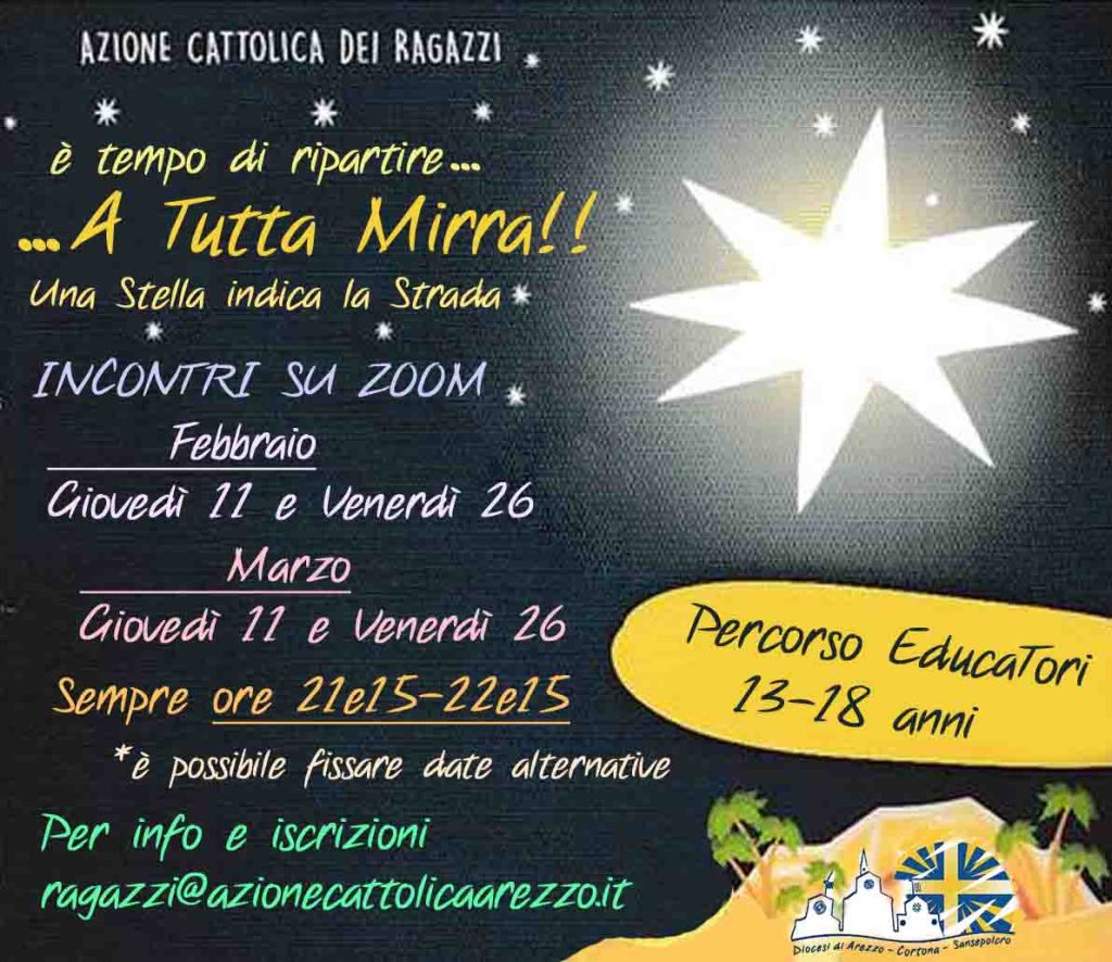 Con il progetto ‘’A tutta Mirra!’’ l’Azione Cattolica di Arezzo Cortona Sansepolcro propone un percorso per sostenere le parrocchie nella formazione dei gruppi giovanili in modo da rendere protagonisti attivi i ragazzi che ne fanno parte. Inoltre, per chi tra di loro volesse, il percorso permette di introdurre i ragazzi al servizio in parrocchia. Le date sono del tutto indicative ed è possibile attivare il percorso in ogni momento, modellandolo in base alle necessità parrocchiali. Siamo a disposizione per chiunque sia interessato!
