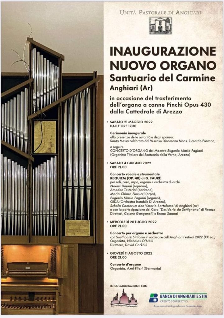 NotizieInaugurazione Nuovo Organo12 Maggio 202228 Febbraio 2025 In occasione del trasferimento dalla Cattedrale di Arezzo, sabato 21 maggio dalle ore 17,30 sarà inaugurato l’organo a canne Pinchi Opus 430 al Santuario del Carmine (Anghiari, Ar). condividi su