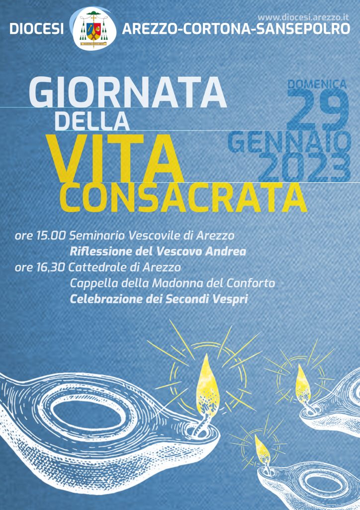 Domenica 29 gennaio, alle ore 16:30, presso la cappella della Madonna del Conforto , il Vescovo Andrea celebrerà la Giornata della Vita Consacrata. L’appuntamento è per le ore 15:00 al Seminario Vescovile di Arezzo dove il Vescovo condurrà una sua riflessione prima di procedere in Cattedrale per la celebrazione dei Secondi Vespri.