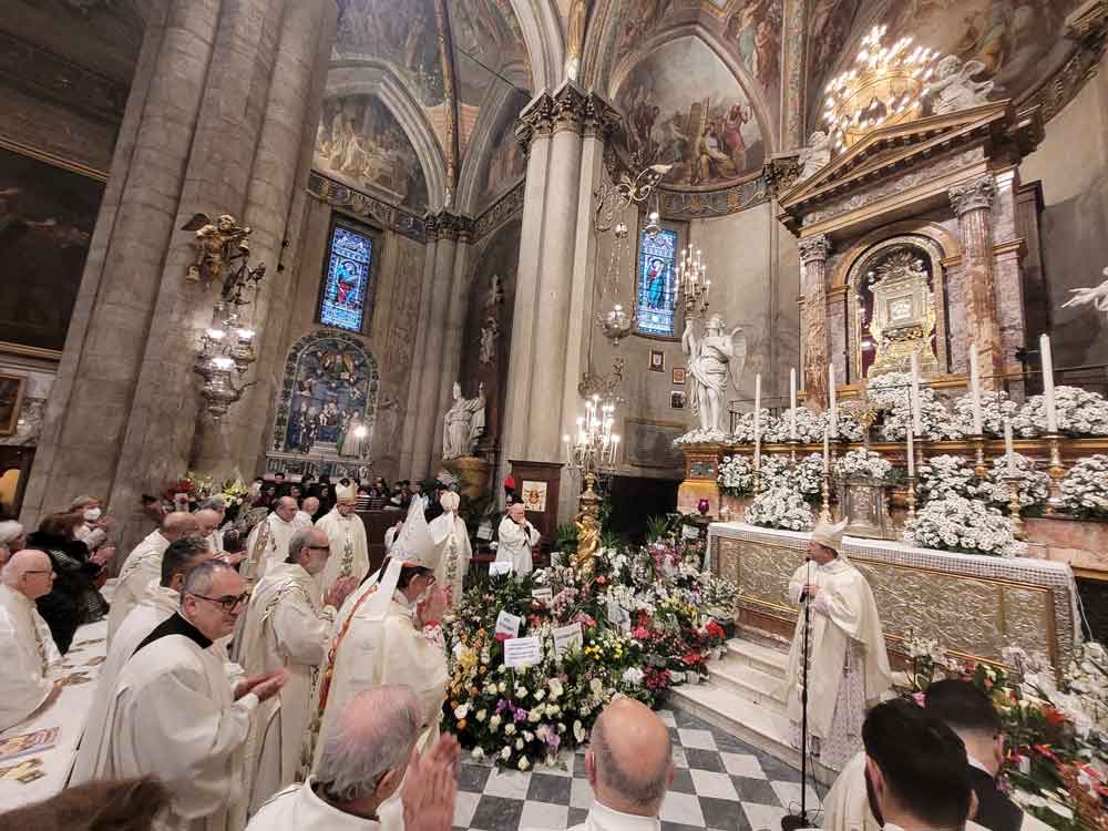 La Messa pontificale delle 10.30 è stata presieduta dal cardinale Augusto Paolo Lojudice, arcivescovo metropolita di Siena-Colle Val D’Elsa-Montalcino e vescovo di Montepulciano-Chiusi-Pienza e concelebrata dal cardinale Gualtiero Bassetti, arcivescovo emerito di Perugia-Città della Pieve e da altri sette vescovi, oltre a mons. Migliavacca (Franco Agostinelli, emerito di Prato; Benvenuto Italo Castellani, arcivescovo emerito di Lucca; Rodolfo Cetoloni, emerito di Grosseto, arcivescovo Riccardo Fontana, emerito di Arezzo-Cortona-Sansepolcro; Giovanni Paccosi, vescovo eletto di San Miniato; Marco Salvi di Civita Castellana; Alberto Silvani, emerito di Volterra).