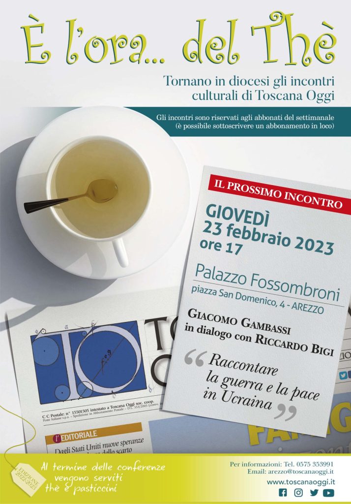 Il ciclo dei Thè di Toscana Oggi, gli appuntamenti che uniscono cultura e convivialità pensati per gli amici del settimanale Toscana Oggi, torna ad Arezzo, con la terza tappa della stagione 2022-23. Il giornalista del quotidiano Avvenire Giacomo Gambassi, porterà la propria testimonianza di inviato in Ucraina, da cui è tornato poche settimane fa. L’incontro è moderato dal giornalista di Toscana Oggi Riccardo Bigi e si svolge a un anno dallo scoppio della guerra. Una occasione preziosa per ascoltare una testimonianza di chi ha avuto modo di vedere con i propri occhi la situazione sul campo, raccontando le sofferenze e le speranze della popolazione, la morte e distruzione disseminata dalle bombe, l’impegno delle Chiese a fianco della gente comune e nel chiedere pace. Una occasione di riflessione su quanto avvenuto negli ultimi dodici mesi e delineare alcune prospettive di sviluppo del conflitto interrogandosi sulle possibili strade per arrivare alla pace.