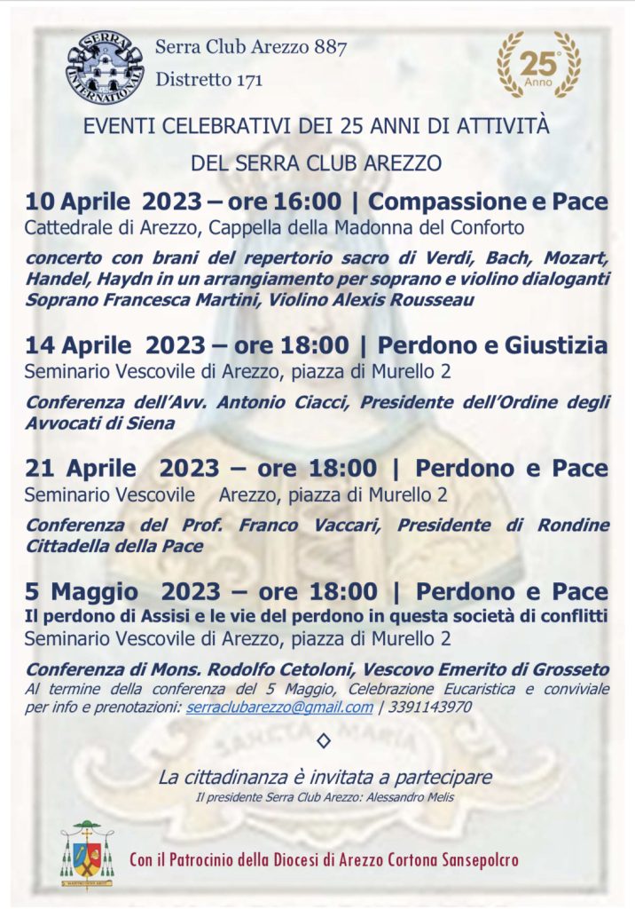 Notizie25 anni di attività del Serra Club Arezzo28 Marzo 202328 Febbraio 2025 Serra Club Arezzo 887 Distretto 171 festeggia i 25 anni di attività attraverso una serie di eventi che cominceranno il 10 aprile prossimo. condividi su