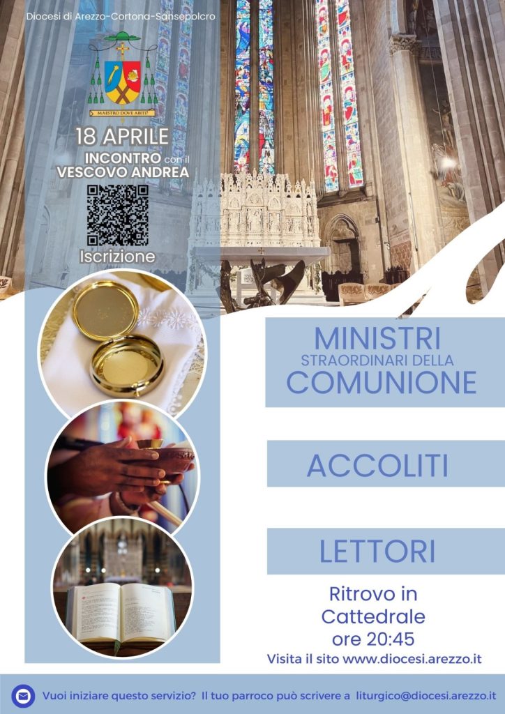 Giovedì 18 aprile, il Vescovo Andrea incontrerà alle 21, presso la Cattedrale, i Lettori, gli Accoliti e i Ministri straordinari della Comunione che svolgono il loro servizio nella nostra diocesi.