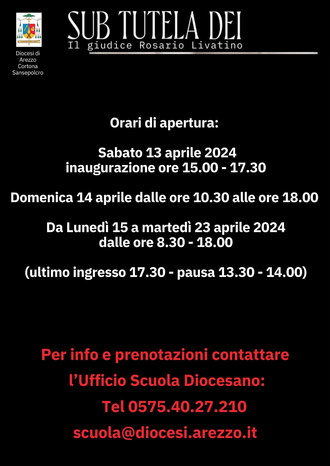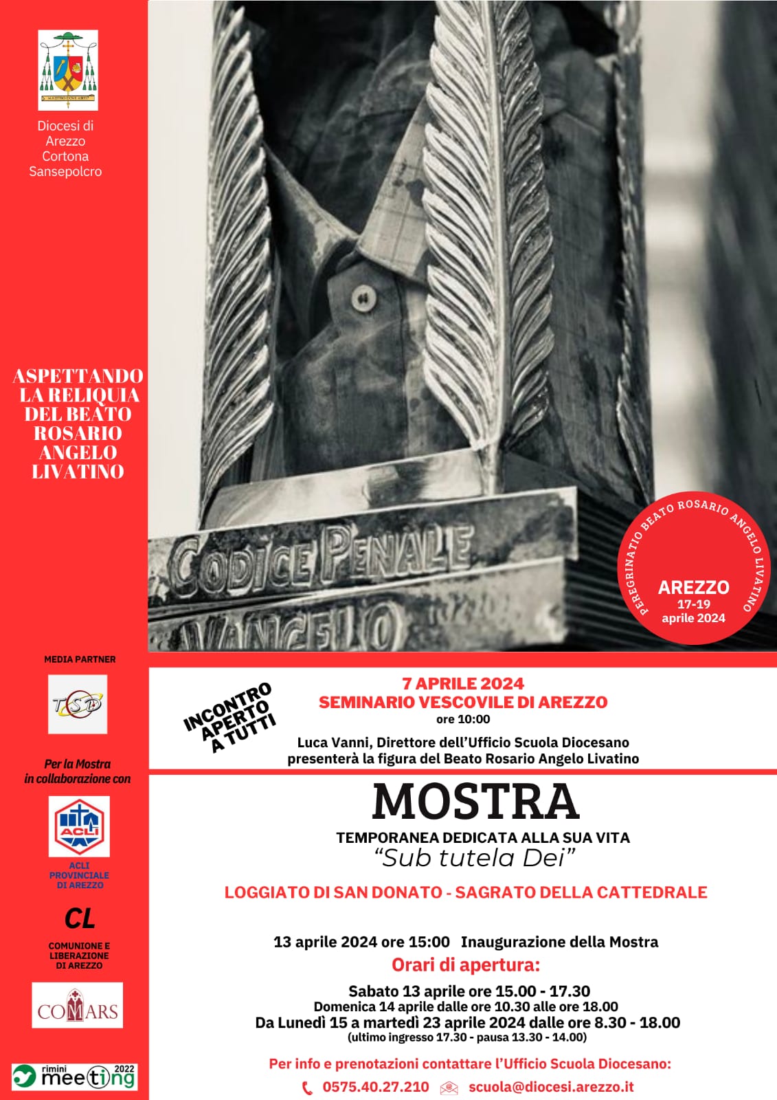 “Sub tutela Dei. Sotto la protezione di Dio”. È questo il titolo della mostra sul giudice Rosario Angelo Livatino, assassinato dalla mafia nel 1990 e proclamato beato nel 2021, che è possibile visitare fino al 23 aprile ad Arezzo nel Loggiato di San Donato. La mostra, presentata per la prima volta al Meeting di Rimini, nasce per far conoscere la figura attualissima del beato Livatino, ed è articolata su pannelli con foto e documenti in cui vengono rappresentati i vari momenti della vita del giovane magistrato, incluso il giorno dell’agguato e della sua uccisione. Il taglio del nastro dell’esposizione, realizzata in collaborazione tra Diocesi, Acli della provincia di Arezzo e Comunione e Liberazione di Arezzo, è stato effettuato dal vescovo Andrea Migliavacca.