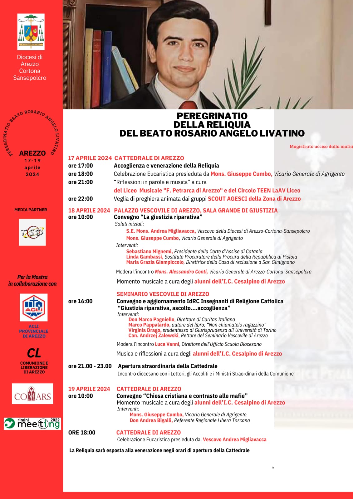 Il pellegrinaggio della reliquia in terra aretina prevede vari momenti liturgici e culturali (programma dettagliato in allegato). In particolare si segnalano il convegno di giovedì 18 aprile alle 10 nel Palazzo Vescovile dedicato al tema “La giustizia riparativa” che vede intervenire, dopo i saluti del vescovo Andrea Migliavacca e mons. Giuseppe Cumbo, Vicario Generale di Agrigento, Sebastiano Mignemi, presidente della Corte d’Assise di Catania, Linda Gambassi, Sostituto Procuratore della Procura della Repubblica di Pistoia, Maria Grazia Giampiccolo, Direttrice della Casa di reclusione a San Gimignano; il convegno è moderato da mons. Alessandro Conti, Vicario Generale della diocesi di Arezzo-Cortona-Sansepolcro. Alle 16, in Seminario si svolgerà il convegno pensato soprattutto per gli insegnanti di religione dal titolo “Giustizia riparativa, ascolto….accoglienza” con interventi di don Marco Pagniello, direttore di Caritas Italiana, Marco Pappalardo, autore del libro “Non chiamatelo ragazzino”, Virginia Drago, studentessa di giurisprudenza e il canonico don Andrzej Zalewski, Rettore del Seminario di Arezzo; modera l’incontro Luca Vanni, direttore dell’Ufficio Scuola diocesano. Un terzo convegno si svolge venerdì 19 aprile alle 10 in Cattedrale ed è intitolato “Chiesa cristiana e contrasto alle mafie” con interventi di mons. Giuseppe Cumbo, Vicario Generale di Agrigento e don Andrea Bigalli, Referente regionale Libera Toscana.