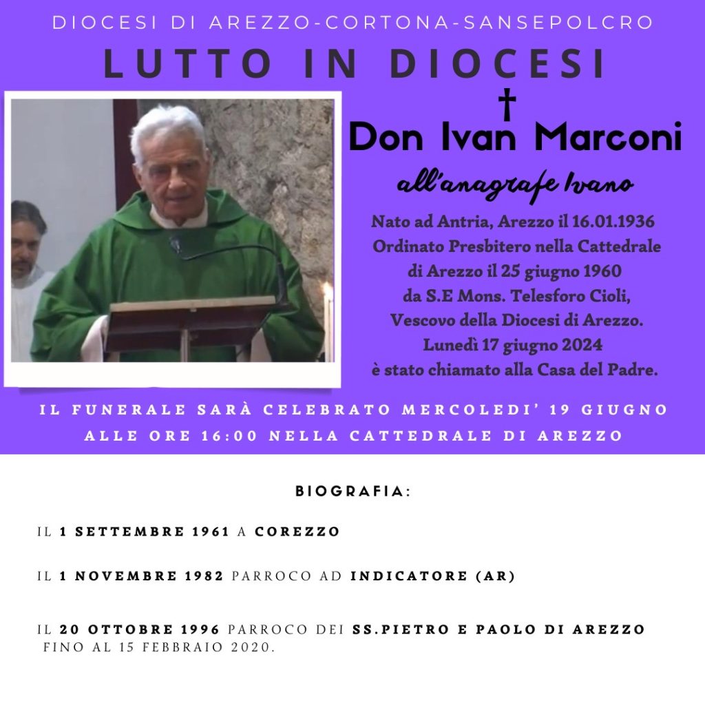 Questa mattina, lunedì 17 giugno, don Ivan Marconi è stato chiamato alla Casa del Padre. Il funerale sarà celebrato mercoledì 19 giugno, alle ore 16:00, in Cattedrale.