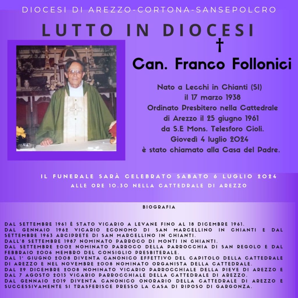 Si comunica che oggi giovedì 04 luglio il CAN. FRANCO FOLLONICI è stato chiamato alla casa del Padre.