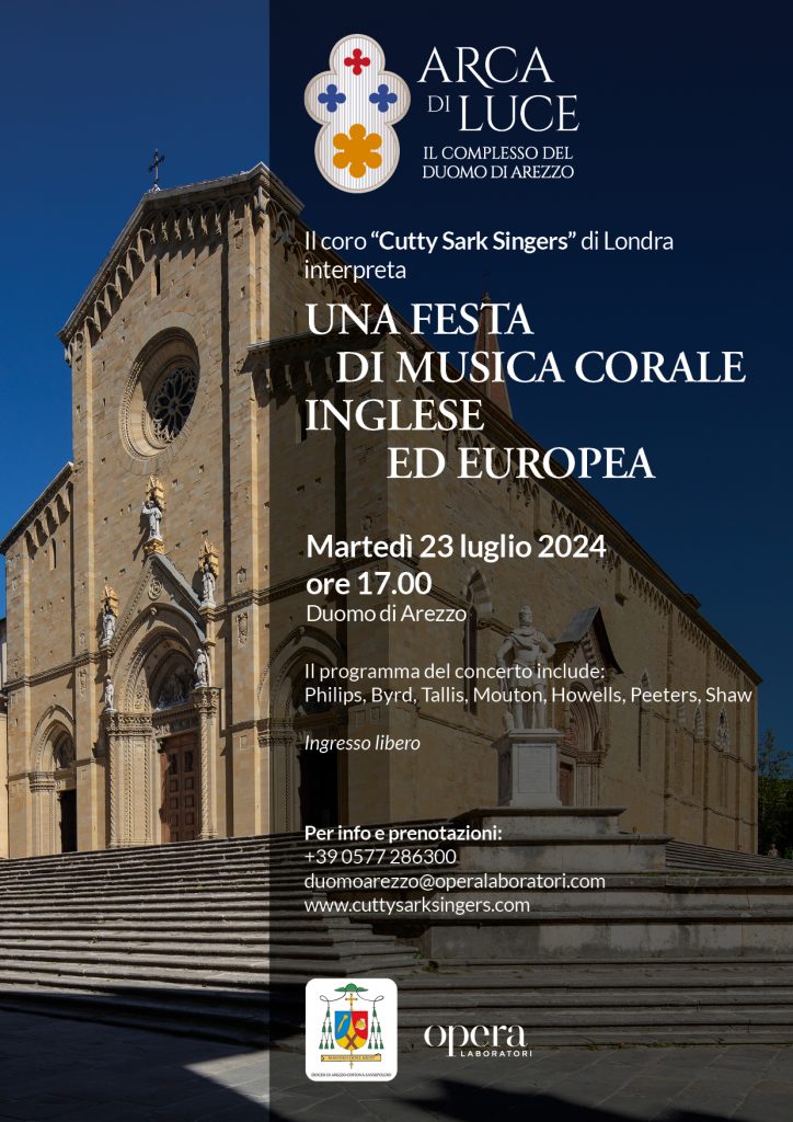 Il prossimo martedì 23 luglio, presso il Duomo di Arezzo, alle ore 17:00 è in programma il Concerto organizzato da Opera in collaborazione con l’Ufficio Musica Sacra e la Cattedrale. L’evento musicale avrà come protagonista il coro Cutty Sark Singers di Londra, che interpreterà “Una festa di musica corale inglese ed europea”.