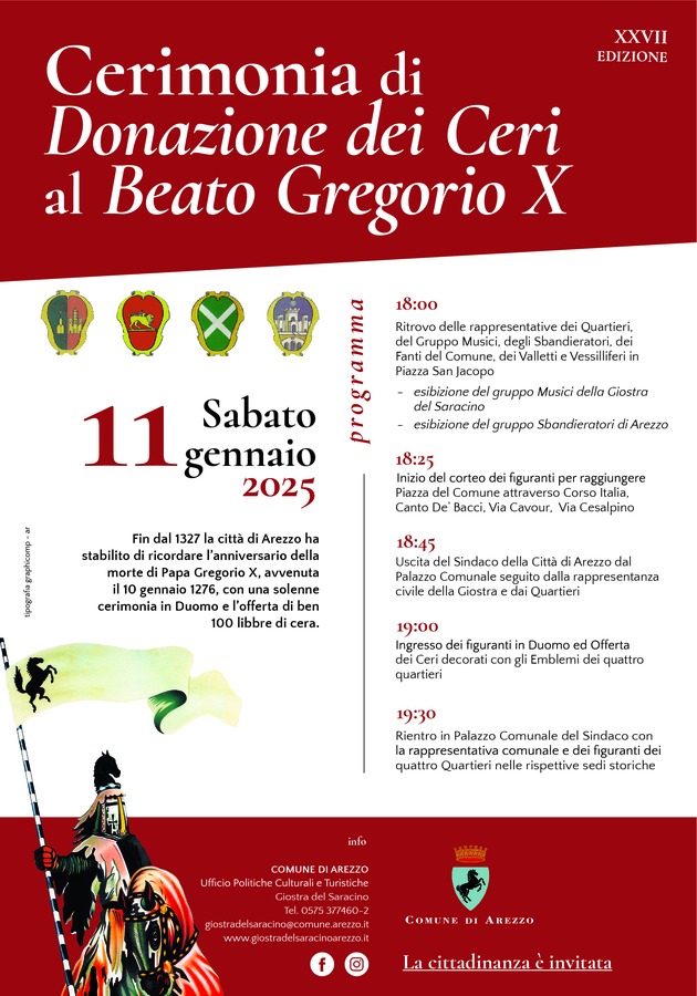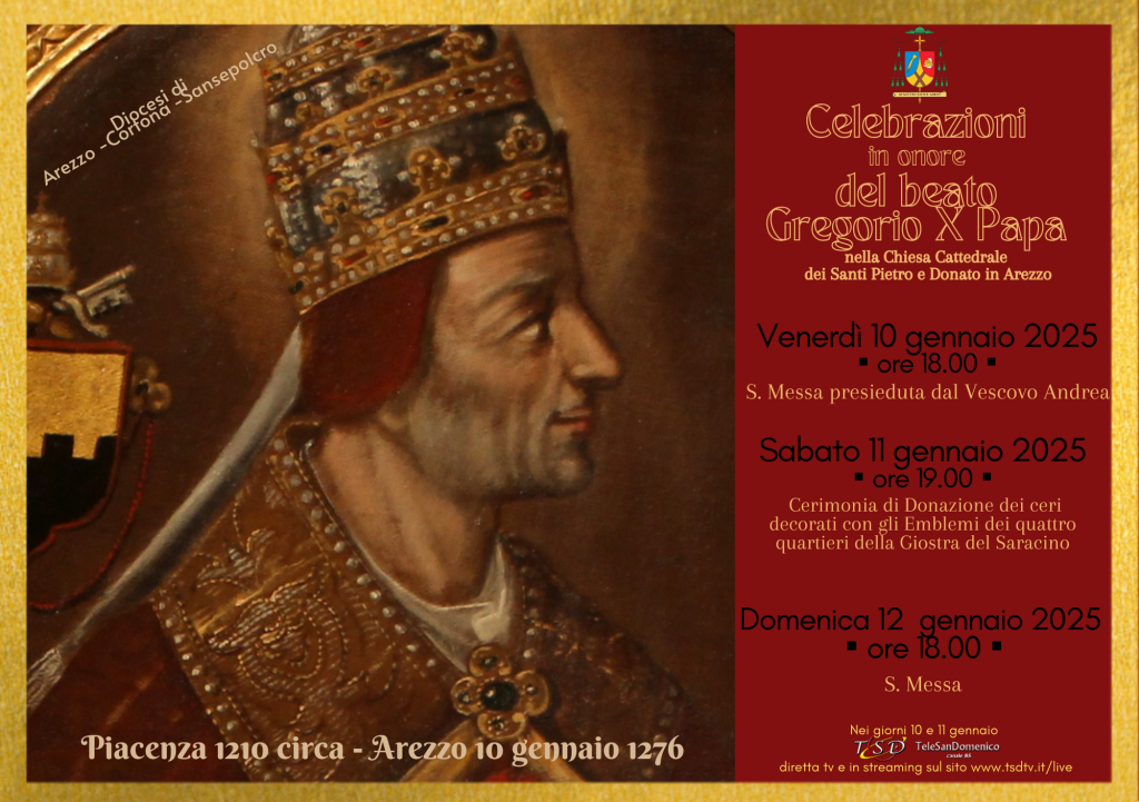Arezzo desidera esprimere ancora la propria riconoscenza a quel Papa medioevale che con la sua donazione la impreziosì della nuova Cattedrale sul colle di San Pietro; ma, ancora di più, a Gregorio X è debitrice la Chiesa universale per l’impegno che quel Papa seppe dare perché la cristianità desse attenzione a Gerusalemme, perché si facesse pace con Bisanzio, perché si aprissero relazioni con le altre religioni, mandando per primo un ambasciatore al Kublai Khan dei Cinesi, perché si riformassero i costumi all’interno della Chiesa e, infine, si facesse pace fra i liberi comuni della Toscana.