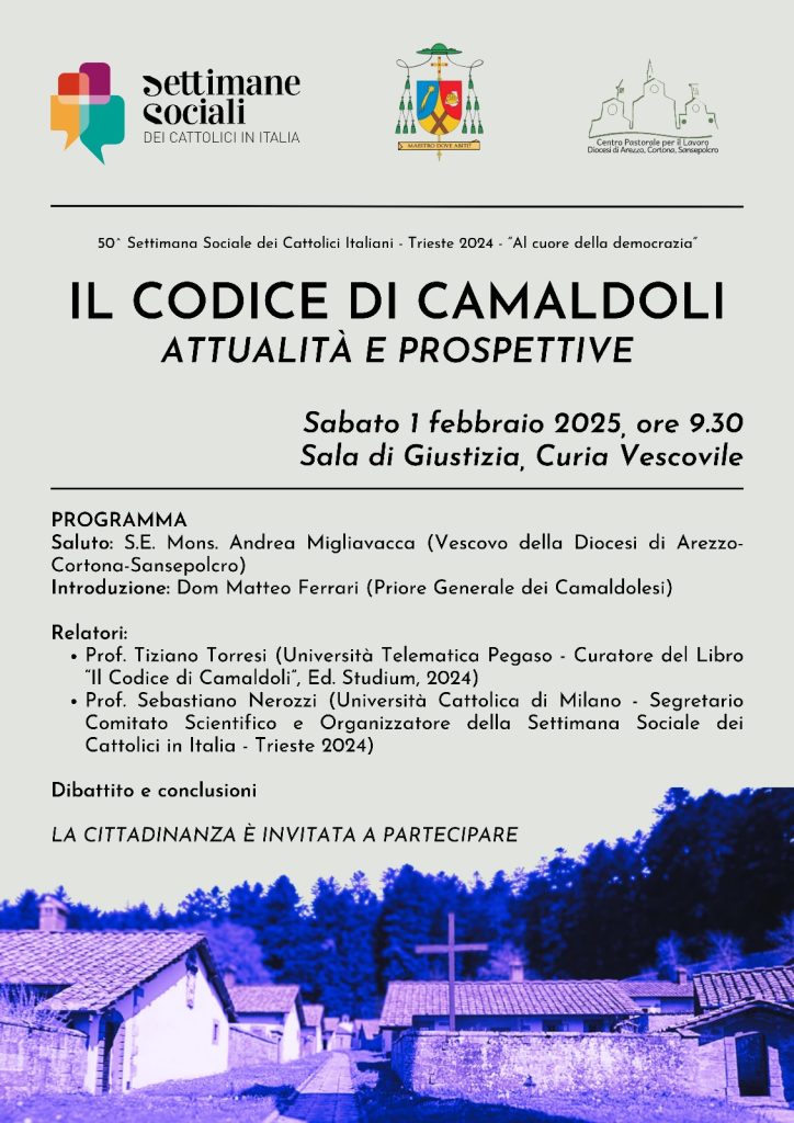 Nel programma e’ previsto il saluto introduttivo del Vescovo Andrea Migliavacca e gli interventi del Priore Generale dei Camaldolesi Dom Matteo Ferrari, del Segretario Nazionale del Comitato Scientifico e Organizzatore della Settimana Sociale dei Cattolici Prof. Sebastiano Nerozzi e del Curatore del libro “Il Codice di Camaldoli”, Ed. Studium, 2024.