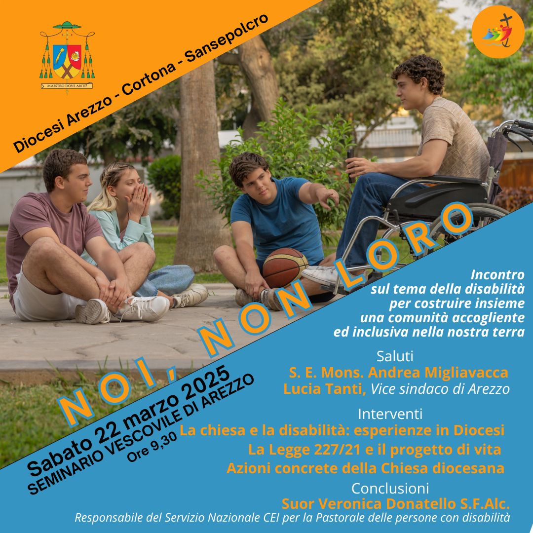 “….nel proprio cammino la Chiesa incontra – e ne trae ricchezza – le diversità della natura umana: la capacità di riconoscerle, accoglierle ed integrarle al proprio interno è segno concreto della vicinanza a Cristo. In un tempo in cui, anche nella società civile, ci si interroga su come la Comunità possa essere di supporto alle Persone più fragili, la Chiesa non può sottrarsi al proprio ruolo: le Persone con disabilità sono parte integrante della nostra realtà. Sentirle “noi, non loro” è la misura della nostra capacità di testimoniare l’amore di Dio verso ogni Persona. Non si tratta quindi di un sentimento di compassione o di mera carità, quanto piuttosto di saper consapevolmente riconoscere l’unicità che caratterizza ciascuno. Anche la nostra Diocesi, pur potendo già contare su numerose esperienze in questo campo, vuol essere parte attiva del cambiamento che l’intera collettività sarà chiamata a vivere nei prossimi tempi anche a seguito delle nuove norme in materia di disabilità recentemente introdotte nell’ordinamento giuridico nazionale. Questi argomenti coinvolgono ciascuno di noi: sacerdoti, consacrati, catechisti, operatori pastorali, educatori, gruppi parrocchiali, ecc; in altri termini ogni espressione della nostra Chiesa deve sentirsi ed essere coinvolta. Per avviare un approfondimento su queste tematiche vi invito all’incontro sul tema della disabilità per costruire insieme una comunità accogliente ed inclusiva nella nostra terra, sabato 22 marzo 2025 alle ore 9,30 presso il Seminario Vescovile: conosceremo alcune realtà che operano del nostro territorio, rifletteremo sulle nuove norme di legge ed inizieremo a vedere concretamente cosa fare nei diversi ambiti della pastorale. Anche questa occasione ci aiuta a mettere in pratica quanto indicato nella mia Lettera Pastorale che esorta ad “andare ed incontrare”. Sarà con noi, per aiutarci in questo percorso, Suor Veronica Donatello, Responsabile del Servizio Nazionale per la Pastorale delle Persone con disabilità della CEI. Potrà essere, nonostante i tanti impegni del periodo, una buona strada per assaporare il tempo forte della Quaresima” . Questo l’invito del Vescovo Andrea a partecipare all’incontro.