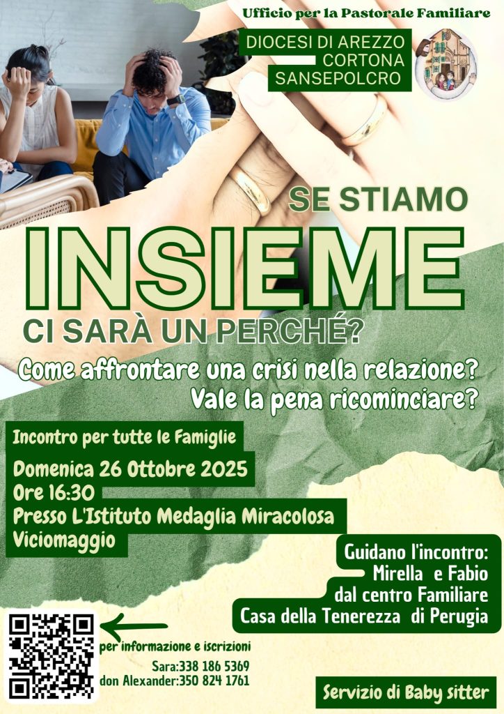 Domenica 26 ottobre 2025 alle ore 16.30 a Viciomaggio presso l’Istituto Medaglia Miracolosa si avvia l’anno pastorale con il primo incontro di Pastorale Familiare condotto dal Centro Familiare “Casa della Tenerezza” di Perugia e curato dai coniugi Mirella e Fabio.