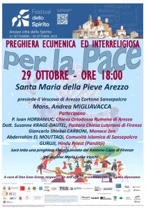 La preghiera finale sarà curata da don Enzo Greco (responsabile dell’Ufficio Ecumenico e Interreligioso Diocesano) e, accompagnata dall’organo di Maria Luisa Veschi e arricchita dalla lettura di un testo inviato dal Rabbino Capo di Firenze farà affidamento sulla presenza di padre Ioan Horbaniuc della Chiesa Ortodossa Rumena di Arezzo, della dottoressa Susanne Krage-Dautel della Chiesa Luterana di Firenze, del monaco zen Giancarlo Shinkai Carboni, di Abderrahim El Mouttaqi della Comunità Islamica di Sansepolcro e del sacerdote indù Guruji.Questo momento di condivisione configurerà uno dei principali patrimoni lasciati in dono dalla seconda edizione del Festival dello Spirito per procedere verso un futuro di fratellanza e di speranza.