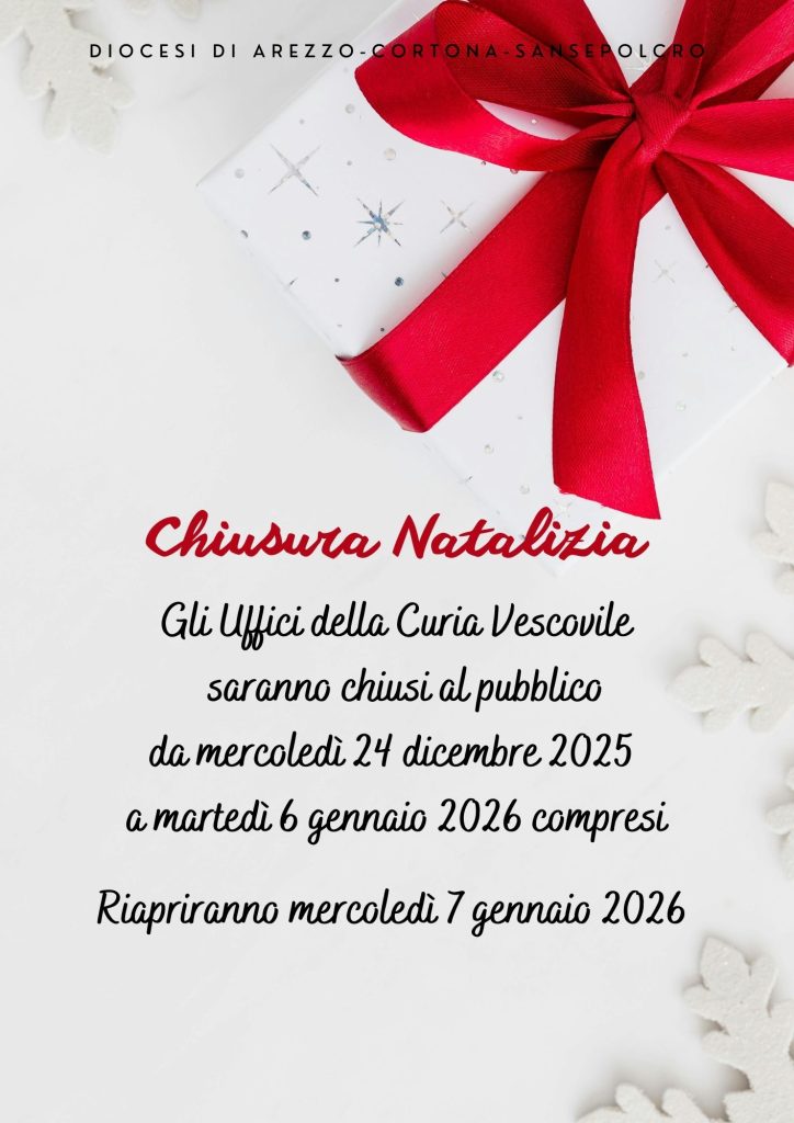 NotizieChiusura degli Uffici per le festività natalizie23 Dicembre 2025 Gli Uffici della Curia Vescovile di Piazza del Duomo e l’Archivio Storico in Piazza del Murello, in occasione di queste festività natalizie, resteranno chiusi al pubblico da domani 24 dicembre 2025 al 6 gennaio 2026 condividi su