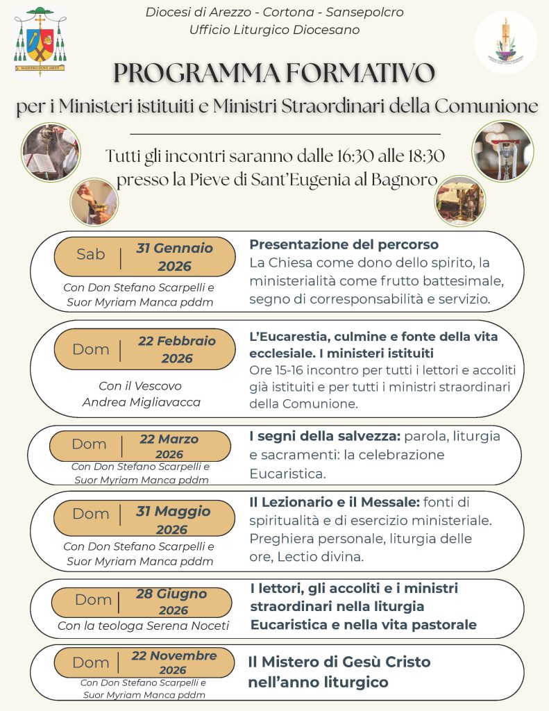 Il cammino con un ciclo di due anni, si avvierà sabato 31 gennaio 2026 presso la Pieve di Sant’Eugenia a Bagnoro in Arezzo, don Stefano Scarpelli, Delegato Vescovile per i Ministeri e la partecipazione dei laici, e Suor Myriam Manca, P.D.D.M, Direttrice dell’ufficio liturgico diocesano, presenteranno il corso con il tema