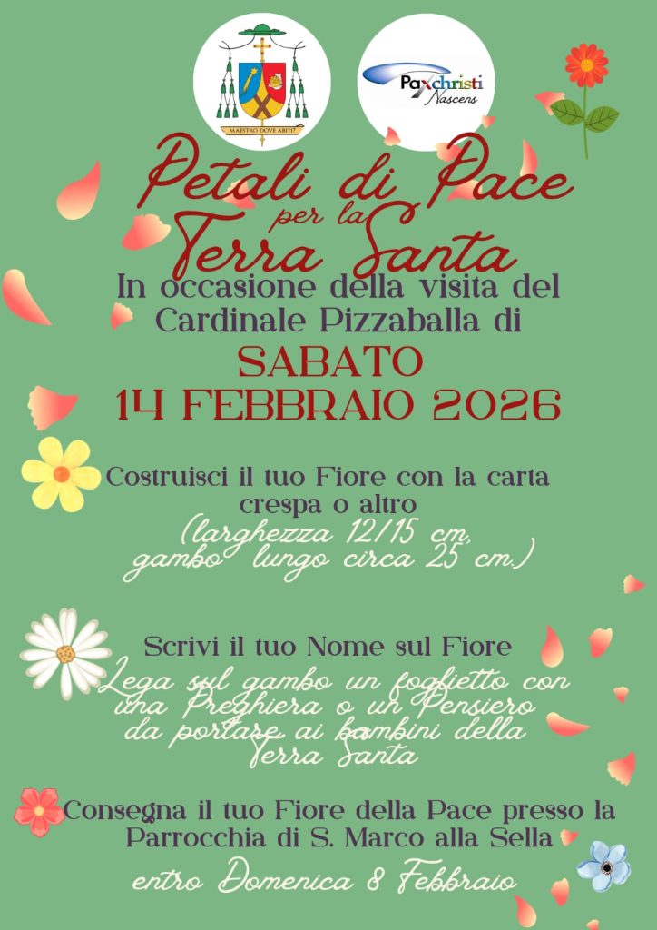 La Diocesi di Arezzo-Cortona-Sansepolcro in collaborazione con il Gruppo Paxchristi di Arezzo propone ai ragazzi del catechismo e delle scuole, l’attività “Fai il tuo fiore della Pace” in vista dell’incontro con il Cardinale Pizzaballa di sabato 14 febbraio 2026.