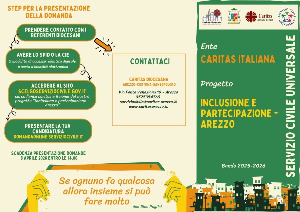 Trascorrere un anno in Servizio civile è un’esperienza umanamente significativa e ricca di relazioni. Tra gli Enti che offrono la possibilità di prestare servizio a giovani tra i 18 ed i 28 anni compresi, c’è anche la Caritas diocesana con il progetto “Inclusione e partecipazione Arezzo”, dieci i posti disponibili (due presso il Centro di ascolto diocesano, due presso la mensa diurna, due presso la Casa di accoglienza San Vincenzo, uno presso il Centro Caritas di Cortona, uno presso l’Ufficio diocesano per le comunicazioni sociali, e due presso Rondine Cittadella della pace). Per aderire è consigliato procedere con un colloquio orientativo preliminare presso la sede Caritas in via Fonte Veneziana (contattare il 339 262 5593).