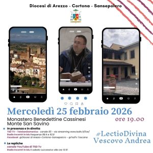 Mercoledì 18 febbraio 2026, alle 21:00 Santa Messa nella Cattedrale di Arezzo LE CENERI Stazioni Quaresimali nei Vicariati Foranei alle 21:00 Celebrazione Penitenziale presieduta dal Vescovo Venerdì 20 febbraio 2026 Casentino – Parrocchia di Subbiano Venerdì 27 febbraio 2026 Castiglion Fiorentino-Cortona – Madonna delle Grazie del Rivaio Venerdì 6 marzo 2026 Valtiberina – […]