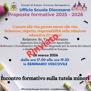 L’incontro del 26 marzo 2026 con Suor Tosca Ferrante è rinviato È confermato comunque l’aggiornamento per gli insegnanti di religione alle ore 17.00 Per tutti coloro che sono interessati alla tematica potranno partecipare all’incontro di domani sabato 14 marzo 2026 alle ore 10.00 in Seminario.