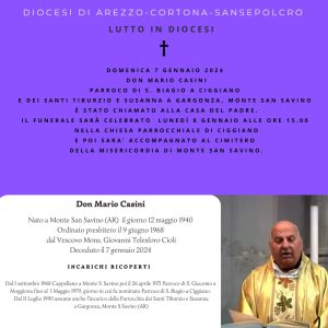 Domenica 7 gennaio 2024 il caro Don Mario Casini , parroco di S.Biagio a Ciggiano e Santi Tiburzio e Susanna a Gargonza, è stato chiamato alla casa del Padre. Il funerale sarà celebrato lunedì 8 gennaio alle ore 15.00 nella Chiesa parrocchiale di Ciggiano. Ai presbiteri si ricorda per la Celebrazione di portare camice e […]