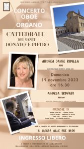 CONCERTO OBOE E ORGANO Domenica 19 novembre 2023 – ore 16.30 presso Cattedrale di Arezzo, con Andrea Jayne Ridilla, oboe, Docente alla Miami University, Oxford, Ohio, e Andrea Trovato, organo, Docente al Conservatorio “L. Cherubini” di Firenze. Andrea J. Ridilla, professore di Oboe alla Miami University (Oxford, Ohio), si è laureato alla Juilliard […]