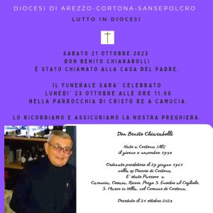 Sabato 21 ottobre, Don Benito Chiarabolli è stato chiamato alla Casa del Padre. Il funerale sarà celebrato domani, lunedì 23 ottobre, alle ore 11:00 presso la chiesa di Cristo a Camucia. Lo ricordiamo e assicuriamo la nostra preghiera.