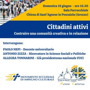 Il Meic Arezzo invita all’evento, realizzato insieme all’Azione Cattolica e intitolato “ – ̀ ”. Guideranno questo dibattito sulla democrazia e sulla partecipazione dei cittadini alla vita della Repubblica Paolo Nepi, docente universitario, Antonio Zizza, ricercatore del Centro Universitario Cattolico, organismo della CEI, e Allegra Tonnarini, già presidentessa nazionale FUCI. MEIC Arezzo