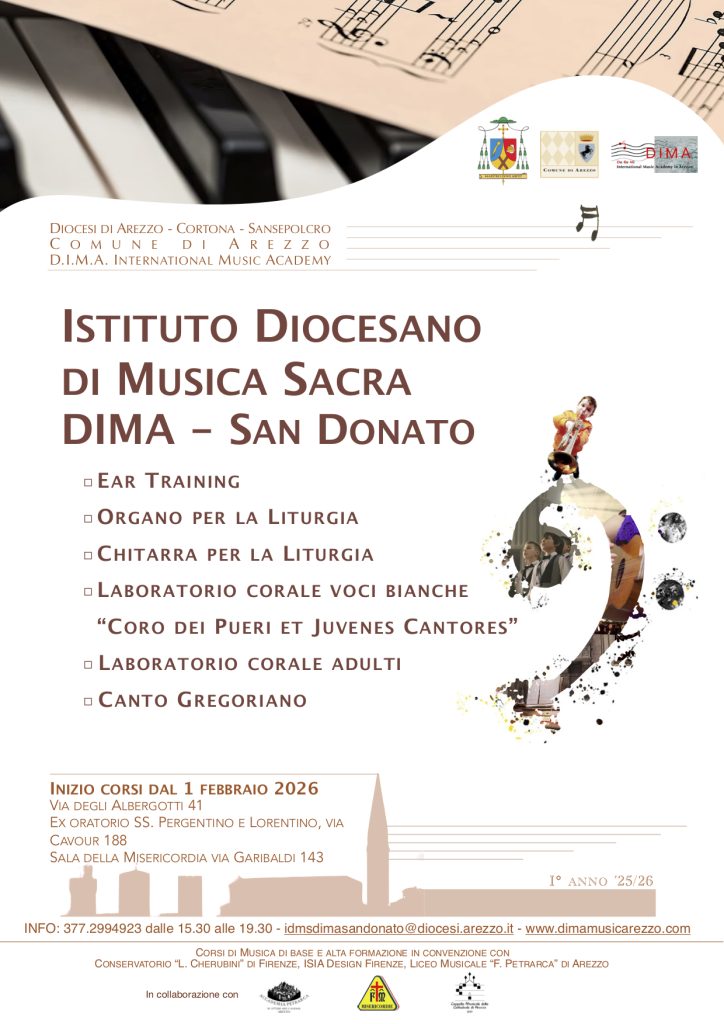 Nella città che ha dato i natali a Guido Monaco, padre della notazione musicale moderna, e a Francesco Petrarca, simbolo dell’umanesimo europeo, prende vita un progetto destinato a lasciare un segno profondo: nasce ad Arezzo l’IstitutoDiocesano di Musica Sacra “D.I.M.A. – San Donato”. Frutto della collaborazione tra la Diocesi di Arezzo-Cortona-Sansepolcro e Associazione Culturale D.I.M.A. di Arezzo, gode del patrocinio e del sostegno del Comune di Arezzo, rappresentando la prima esperienza strutturata di questo genere per la città, ponendosi come luogo stabile di formazione, diffusione e valorizzazione della musica sacra e liturgica.